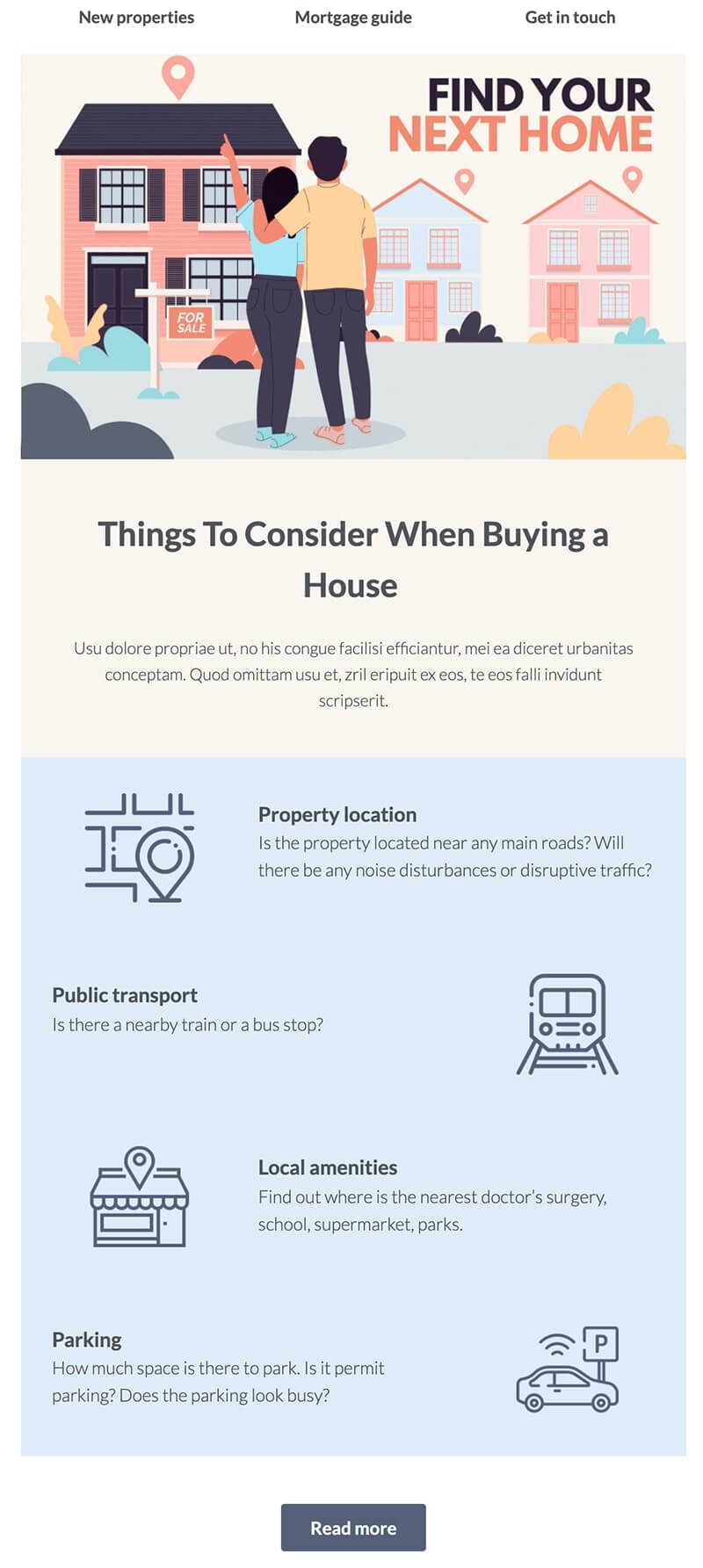 This Buyers Guide to Buying Newsletter Template below is perfect for this as it highlights key considerations (such as location and transport), using information design techniques such as iconography. The template also allows for additional modules of content, such as video or editorial content links to be included.
