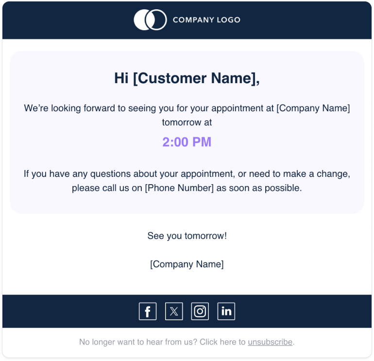 The final email is a way to ensure the appointment hasn’t slipped your customer’s mind. You could send this 24 hours before the appointment, or at a time that makes sense for your cancellation policy.