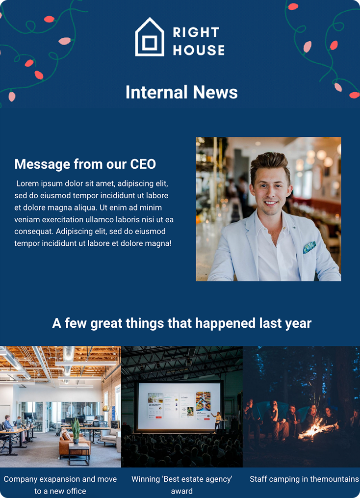 Get it right with an email builder. All employee newsletter templates are designed to be responsive, no matter where or how they’re opened. So, they’ll even look great if you export your HTML designs to Gmail or Outlook