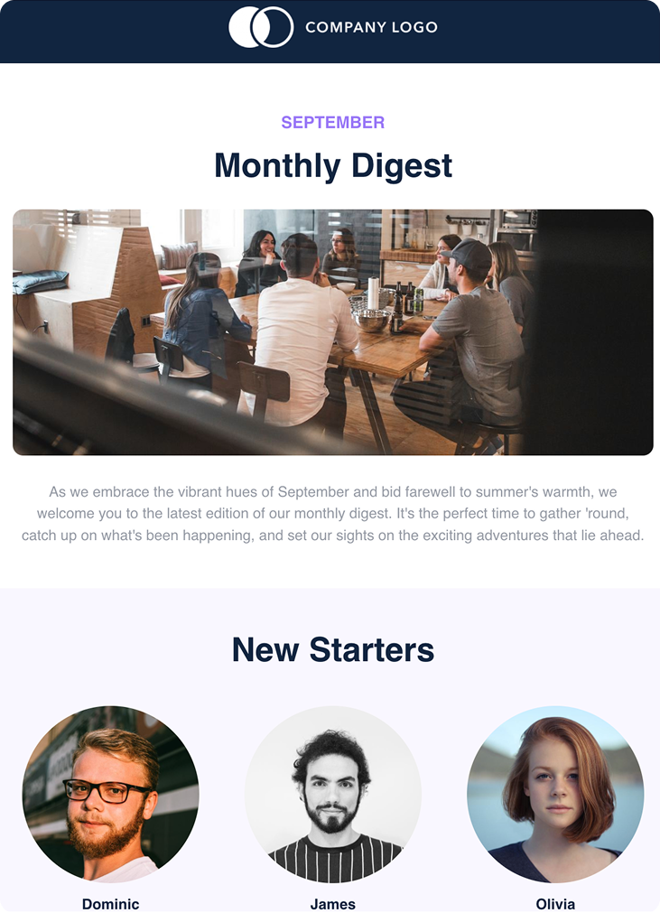 This newsletter is the perfect space to promote fun company events that strengthen workplace culture and give employees something to look forward to.