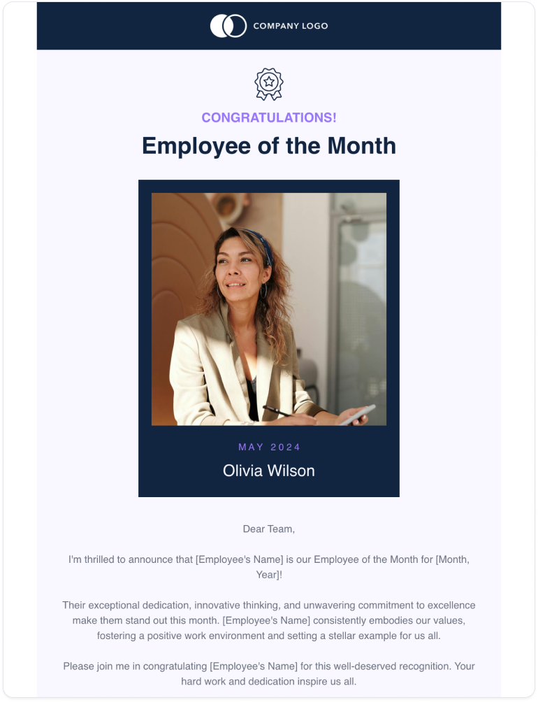 Create an Employee of the Month newsletter to shine the spotlight on a different employee each month. Use an email template so there’s no need to redesign the layout every time this rolls around.