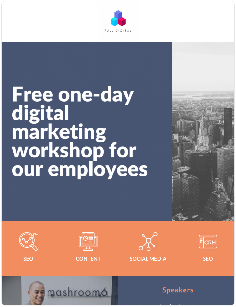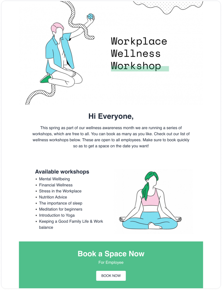 This template is great for staff or subscribers, as it’s effective for many event types. It works great for letting staff know about upcoming events or workshops at the workplace or elsewhere.