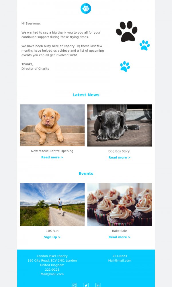 As you can see, you can start off your newsletter with any overall message - be it a thank you, a company update, or whatever else you have to share. Then, it jumps into a section for the latest news that can link to your organization’s blog. Following that row of image, you can promote upcoming events to ensure that your community can be involved.