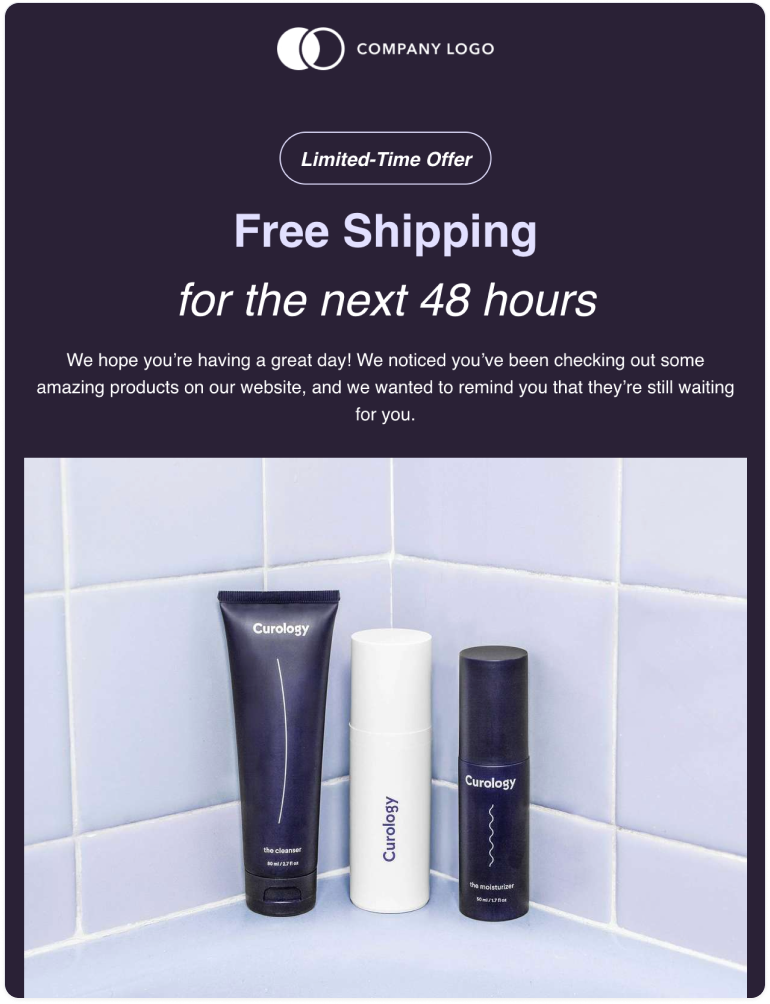 For best results here, give product recommendations based on the user’s browsing history, and create fear of missing out (FOMO) to encourage a purchase. For example, offer free shipping for a limited time only, like Aura Bora does here.
