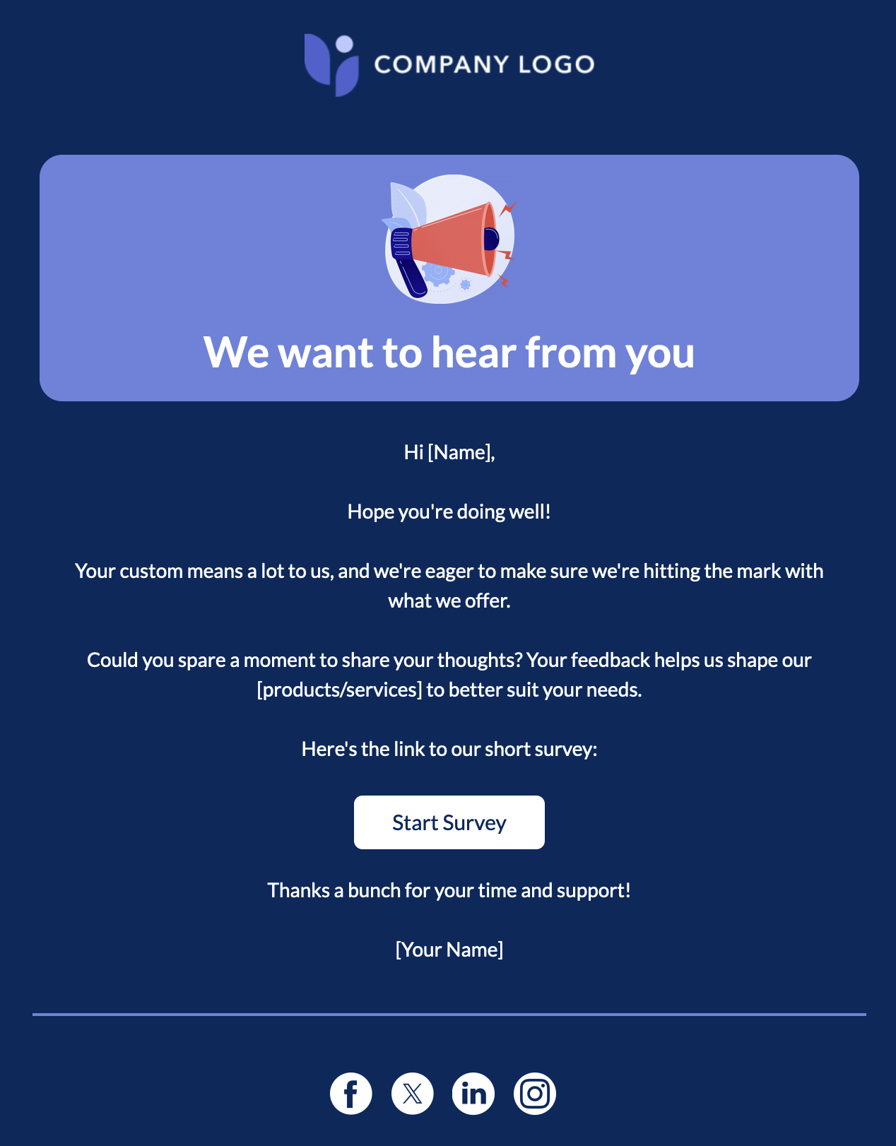 Send the right message to readers. Using a feedback survey email template can help guide your body text.