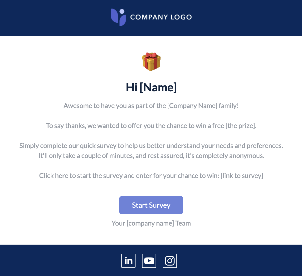 Everyone loves a giveaway. This survey email outlines the possibility that the recipient will win a prize if they take part. Be sure to include what that prize is to build excitement and boost responses.