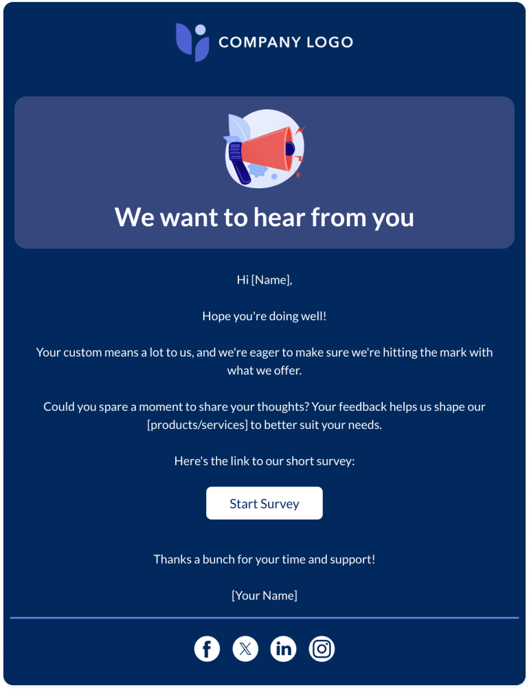 Bring an email builder into the mix to access beautiful, customizable templates for every stage of the survey process. With a tool like Publicate, you can reduce the email design process to minutes without sacrificing design quality.