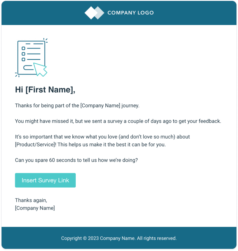 This is a gentle nudge for recipients who missed your first survey invitation – or just forgot to share their answers. Send a follow-up email 48-72 hours after the first survey invitation.