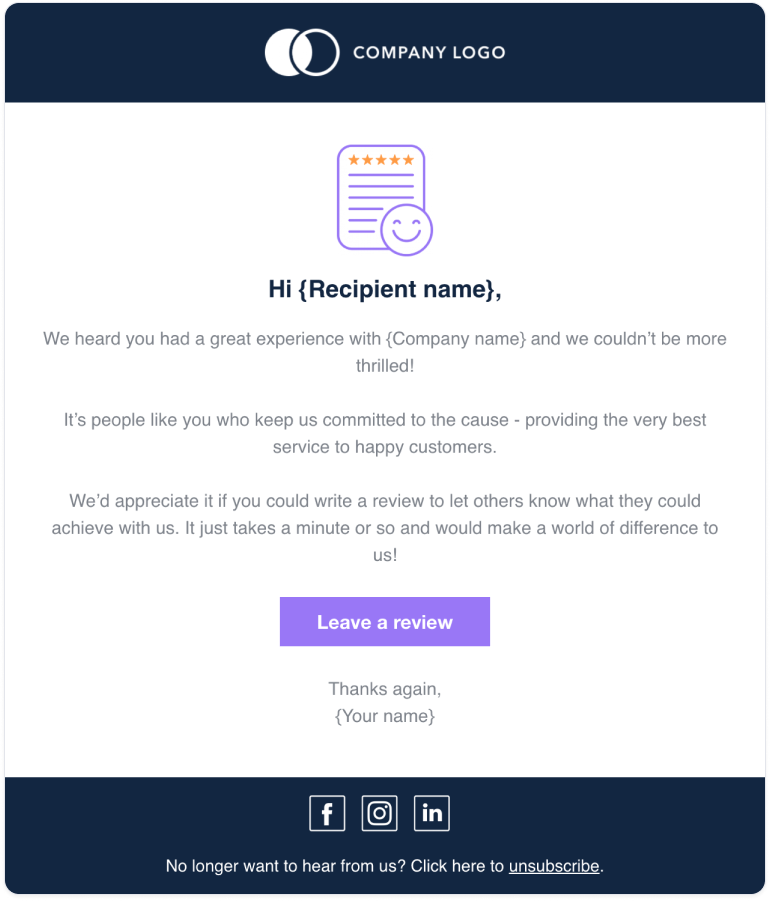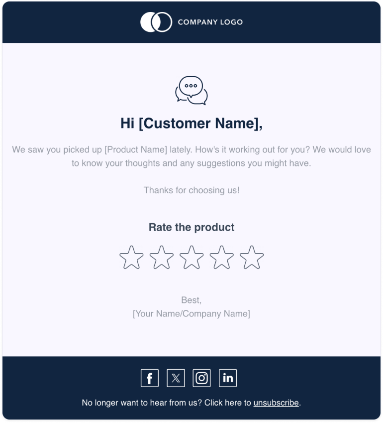 Keep this short and simple, and don’t forget to use open questions (e.g. “Let us know if you have any suggestions!”) to invite the customer to share their opinions without holding back.