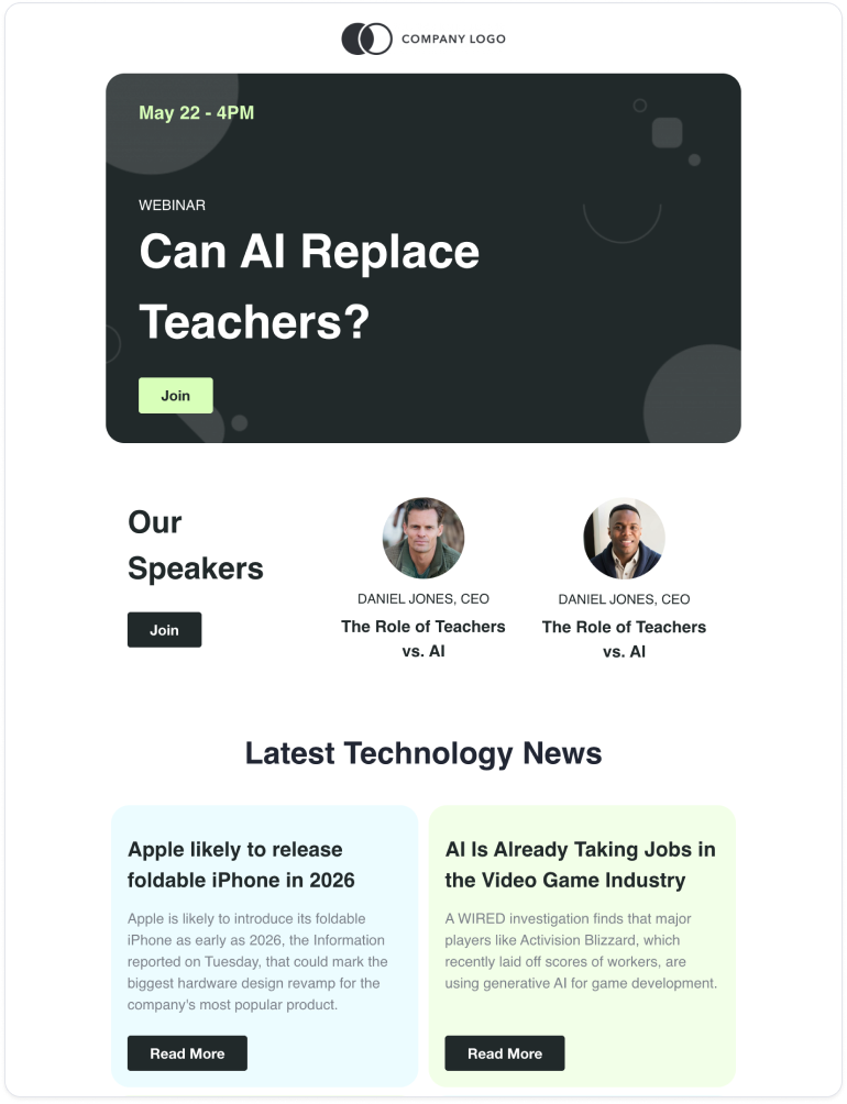 Webinar invitation email templates in email builders have been designed by email marketers, coders and designers and follow all best practices to maximize engagement.