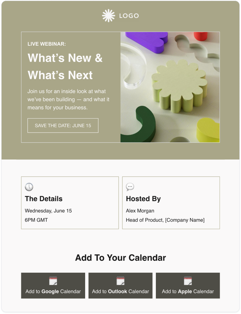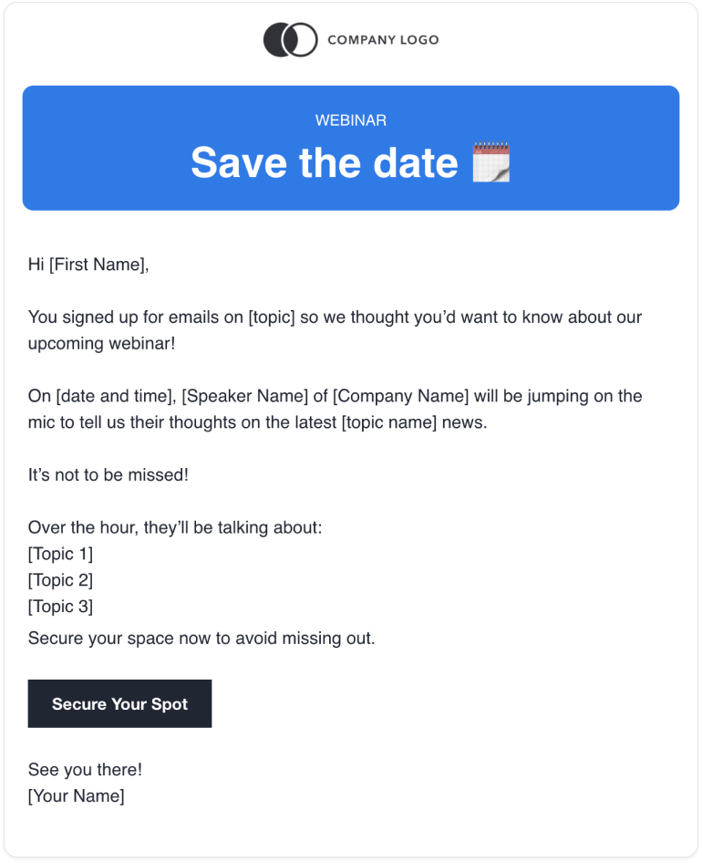 We’ve gathered a selection of templates. Simply customize your chosen template with your webinar’s details and copy and paste it into your favorite into your email platform.